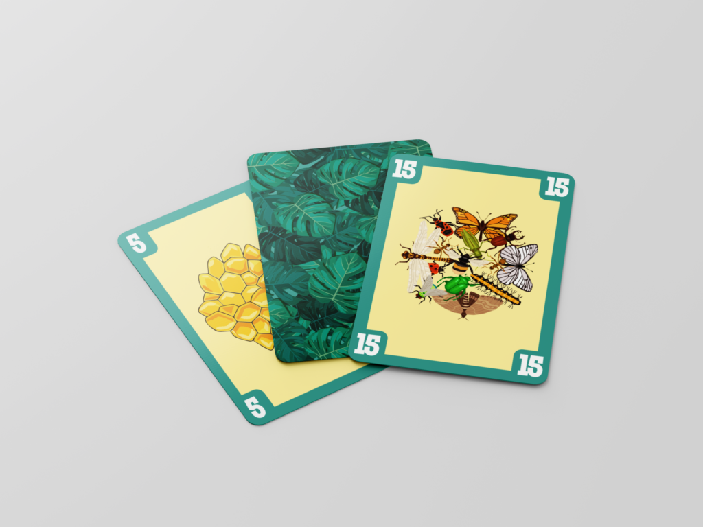 - Chaque joueur pose une carte « Insecte » ou « Pépite d’or » de son choix au centre de la table.